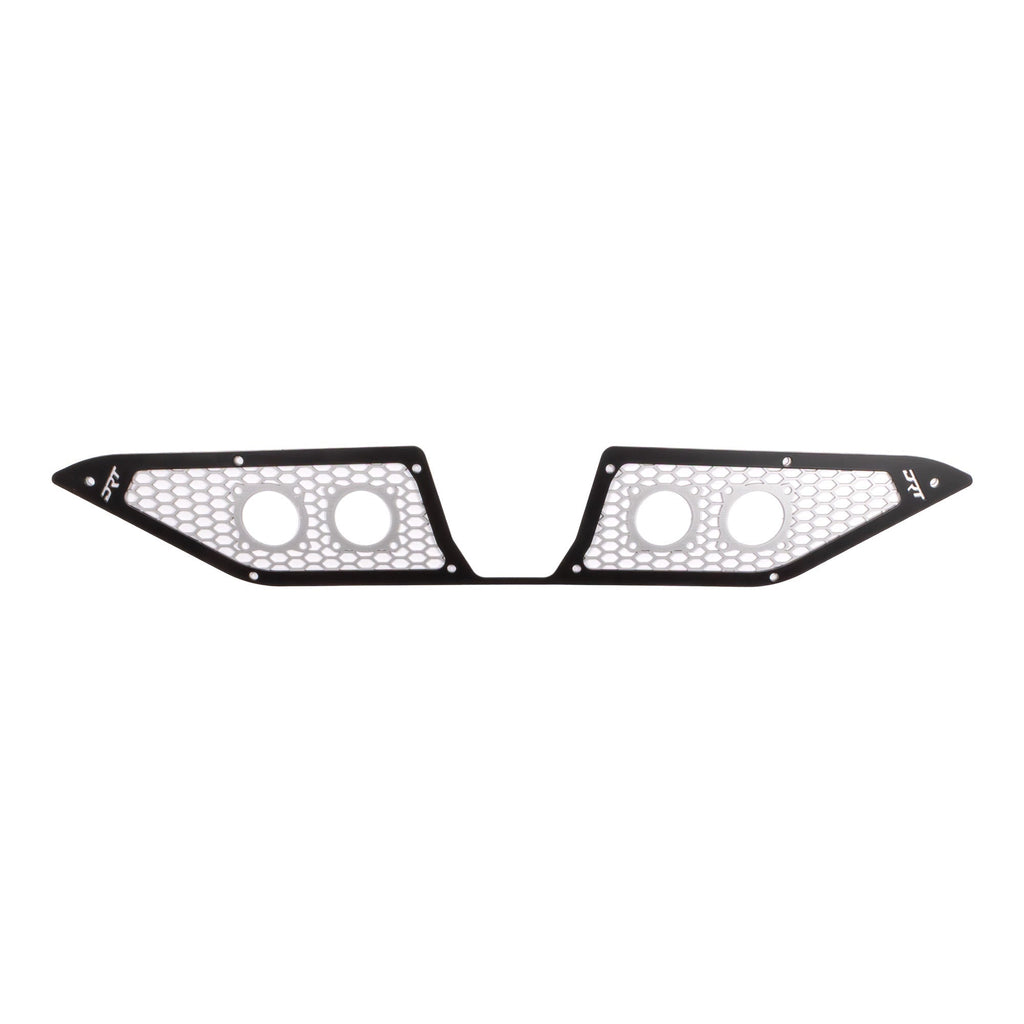 DRT Motorsports Can Am Maverick R Rear Fascia Chase Light Kit is the perfect way to add chase lights to the rear of your Maverick R. Set and installed at the furthest rear point of the vehicle, the DRT Motorsports Can Am Maverick R Rear Fascia Chase Light Kit, provides excellent visibility without any risk obstructions like a spare tire carrier or cargo. While traditional mounting locations are usually located on the cage and over the bed area, this area often gets blocked with the addition of tire carriers, truck enclosures, etc. The DRT Motorsports Can Am Maverick R Rear Fascia Chase Light Kit lets you choose your favorite light brand and add chase lighting that is completely integrated into the OEM rear fascia panel. The DRT Chase Light Kit is made of layered laser cut 6061-T6 aluminum plates that are used to mount and secure the lights. The surround plate is finished in our premium black powder coat while the laser cut mesh panel is finished in a bright anodize. Our mesh design, like the OEM, keeps the plastic from becoming heat saturated by letting heat rise and escape through the mesh profile. We provide premium black plated stainless-steel hardware and a threaded retainer system to bolt into place. DRT Motorsports Can Am Maverick R Rear Fascia Chase Light Kit can easily be customized with powder coat or painted to add a custom look to your ride. Plastic trimming of the OEM rear fascia to install lights is required.