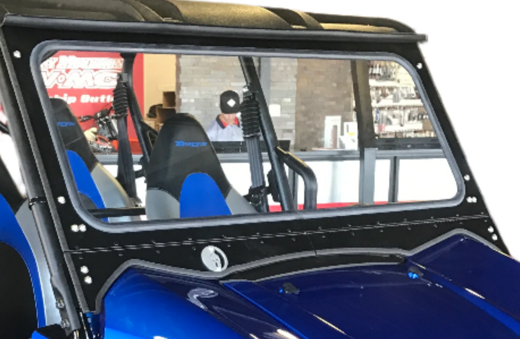 Every windshield we produce is made with Laminated Clear Safety Glass just like automobile glass. Each windshield has two independently working Vents which can be open or closed depending on the weather. The Aluminum Frames are Powder Coated in Textured Black which is more scratch resistant than standard smooth Powder Coats. Each windshield was templated by our team of fabricators using the best technology and equipment to get the best fit possible.