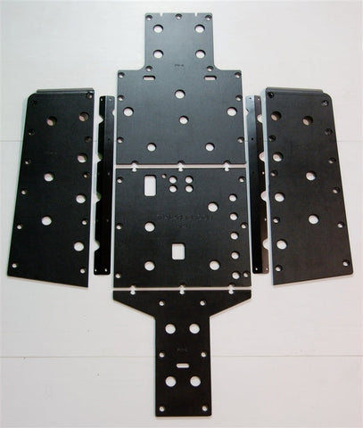 Trail Armor's full skid plate set for the Honda Pioneer 700-4. Made from 1/2" supertough polymer, these plastic skids absorb shock to the bottom of the vehicle with no dents or rust and are lighter than traditional metal skids. Strategically placed drain holes allow dirt and debris to wash out - you don't have to remove them to clean out the belly your vehicle. This skid set also features a convenient oil drain access panel and access to the oil filter. Skids come in easy to install jointed sections that cover the full length and breadth of the vehicle, including the front and rear differential. Integrated side skids help protect outer floor board and rocker panel edges. Mounting hardware and instructions included. A-arm guards shown in picture are sold separately, see product TA011ARMIMP-HP700. Fits years 2014 - 2024.