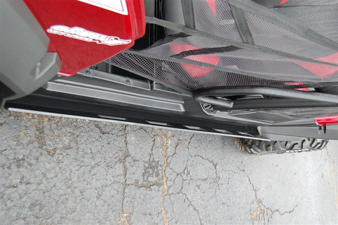 Trail Armor's nerf sliders for the 2008 - 2014 Polaris RZR4 800 are made of 1/2" supertough polymer. Because they are made of plastic, they are lighter than typical metal skids, and absorb the shock of impact - no dents and rust. This two piece set bolts up tight to the vehicle's bottom and does not hang down to get caught on obstacles. It protects from wheel well to wheel well, rolling up the sides to safeguard the plastic rocker panels. Strategically placed drain holes allow dirt and debris to wash out for drainage and easy cleaning. Mounts easily in factory pre-drilled holes. Trail Armor's center skids for the RZR4 (shown spanning vehicle center front to rear in pictures) are sold separately. Slider nerfs consist of left and right side panels only. Colors are considered a special order and are non-returnable.