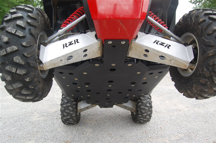 Trail Armor's nerf sliders for the Polaris RZR 800, RZR 570, RZR 800 S, RZR 800 XC and RZR S 570 are made of 1/2" super tough polymer. Because they are made of plastic, they are lighter than typical metal skids, and absorb the shock of impact - no dents and rust. This two piece set bolts up tight to the vehicle's bottom and does not hang down to get caught on obstacles. It protects from wheel well to wheel well, rolling up the sides to safeguard the plastic rocker panels. Strategically placed drain holes allow dirt and debris to wash out for drainage and easy cleaning. Mounts easily in factory pre-drilled holes. Nerfs can be installed with Trail Armor's center skids or with the OEM plastic skid (will have to cut off tank guard lip on OEM shield). Trail Armor's center skids sold separately. See product code TA012SKIDCENTER-RZR-S or TA012SKIDCENTER-RZR570. For those who want to maintain a 50" trail width on the standard RZR 800 or the RZRXC, please choose option below "Trimmed for 50" Max Trail Width or standard rocker panel protection please". STANDARD (untrimmed) rocker panels shown in pictures.Now available in color! SEE FITMENT SPECIFICS ON ALSO FIT CHART. COLORS ARE CONSIDERED A SPECIAL ORDER AND ARE NON-RETURNABLE. THEY ARE NOT PIGMENT MATCHED TO ANY OEM MANUFACTURER'S COLOR SCHEME. PLEASE CONTACT US FOR ANY QUESTIONS ON MATCHING OR BLENDING WITH YOUR VEHICLE'S PLASTIC AND/OR GRAPHICS.
