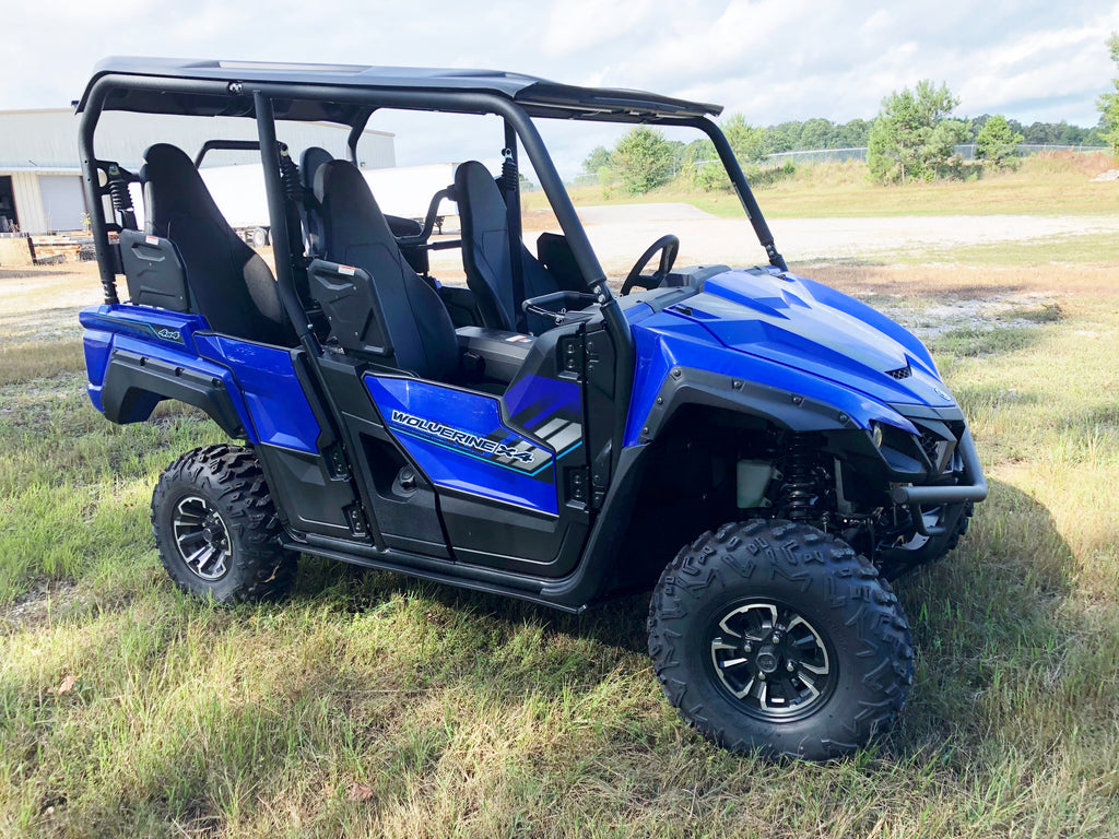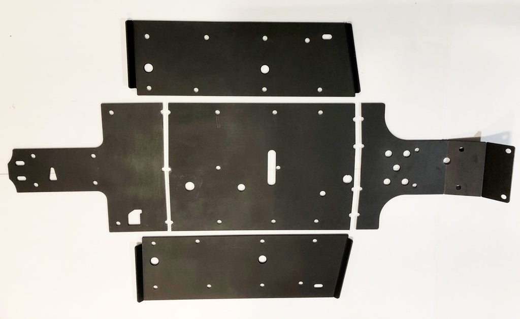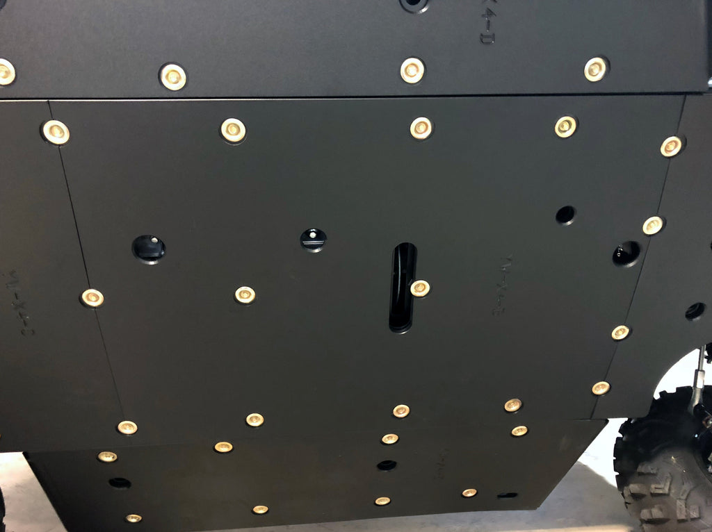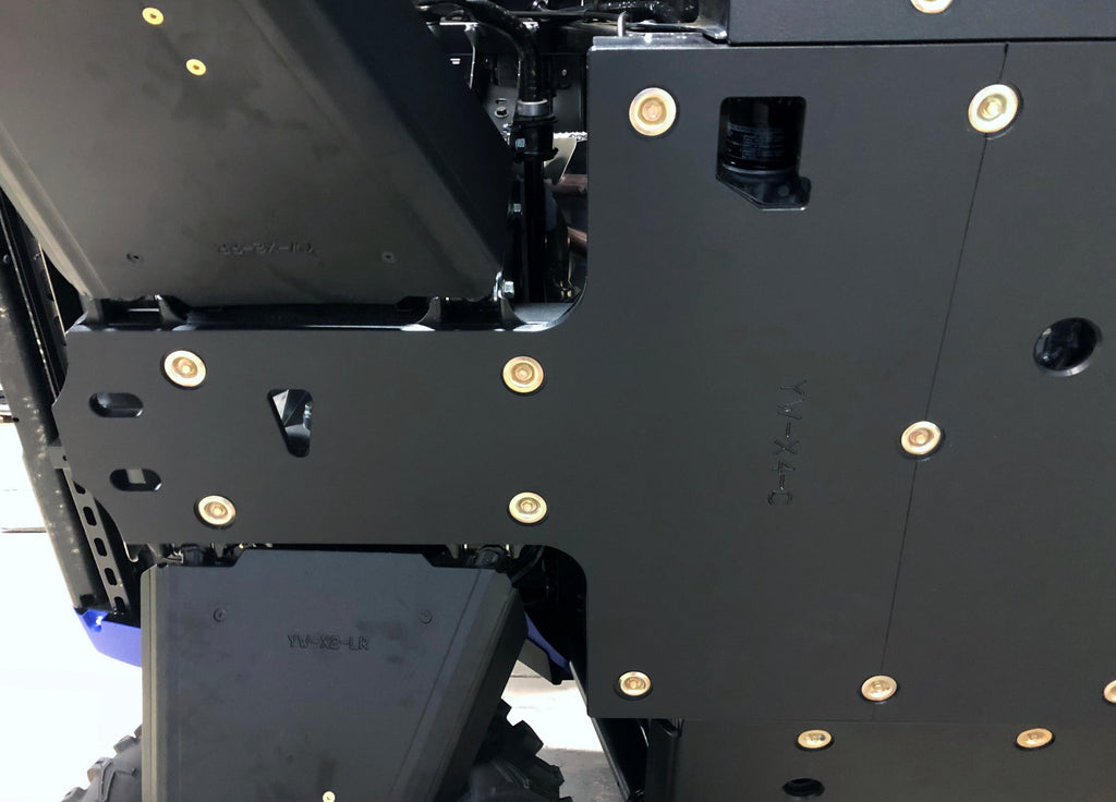 Get the best in under vehicle protection with Trail Armor's full skid plate set for the Yamaha Woverine 850 X4 (2018 - 2022), X4 850 Hunter, X4 850 Special Edition (2018 - 2020), X4 850 SE (2019), X4 850 XTR (2020 - 2024) and X4 850 R-Spec (2021 - 2024). Made from Super Tough polymer, these 1/2" plastic skids are lighter than most traditional metal/aluminum skid plates (see specs below) and because they have no "impact memory", they absorb shocks to the bottom of your vehicle without the dents, galling and corrosion of metal/aluminum skids. Trail Armor was the first in the industry to design skids with the formed leading edges (front and rear) featured on our skid plates. These leading edges protect vulnerable frame edges and wheel wells from blunt edge impacts and act as a starting edge to slide over obstacles without the resistance and drag of metal skid plates. Additionally, these skids for the Wolverine X4 are designed side panels that extend approximately a 1/2" past the rocker panels to protect the vulnerable sides and rocker panels of your vehicle. Compare Trail Armor's skid set coverage with other skid manufacturer's like items - slider nerfs are either sold separately or the bottom skid coverage ends before the rocker panel, leaving this part of your vehicle unprotected. Trail Armor's skid plates come in easy to install panels that cover the full length and breadth of the vehicle, including the front and rear differential. Access holes to service points and oil drains make maintenance a breeze. Strategically placed drain holes allow dirt and debris to wash out - you don't have to remove them to clean out the belly your vehicle. However, if needed, individual panels may be removed to access different areas without removing the entire skid plate. Recessed mounting holes protect fasteners from damaging blows and keeping all bolt heads from protruding the skid's surface. All kits come with corrosion resistant hardware and photo-documented installation instructions. Installation videos, if available, are provided as a YouTube video on our site. A-Arm guards if shown installed in pictures are not included and sold separately. Colors are considered a special order. They cannot be cancelled once ordered or returned. If you have any questions about colors and your graphics, please contact us and we'll give you our honest opinion. See Also Fits Chart in Gallery for specific year and model fitment.